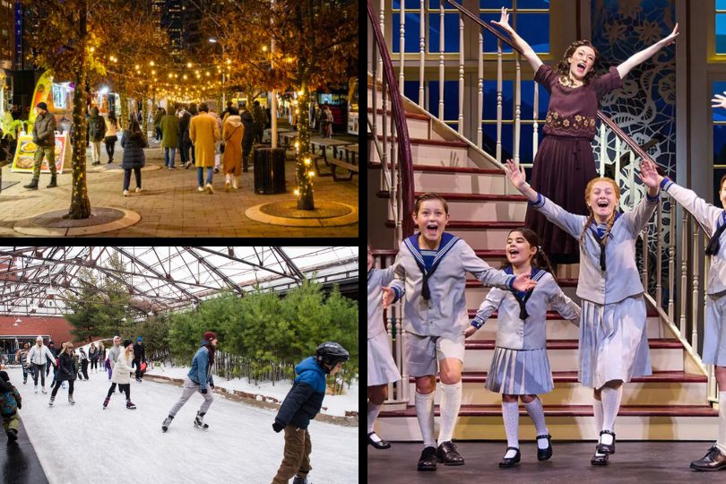 Harbourfront Centre Winterfest (top left); Ice skating at Evergreen Brick Works (bottom left); Mirvish Productions’ The Sound of Music (right)
